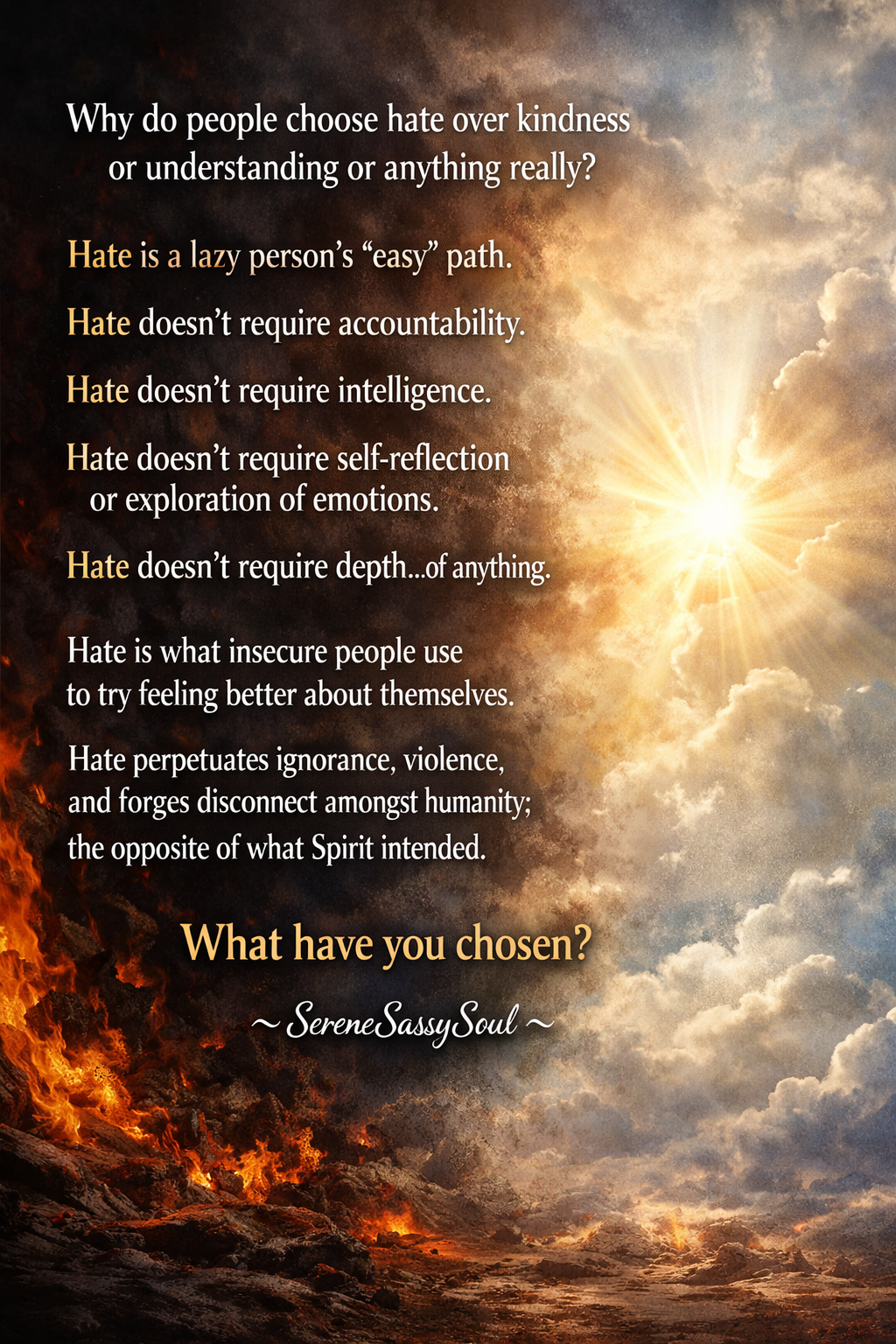 Hate Feb 18 Written By Ayana Use your mind, your heart and your experiences to choose your path. #Scribe #SpilledExpression #SpilledThoughts#Writing#Acceptance #Awareness#Belief #Consciousness #createANDdisrupt #creativity #cultivateANDblossom #Empowerment #Energy #Expression #Freedom #Fulfillment #Healing #HeartFlow #Inner-peace #Inspiration #Personal Growth #Personal Power #Peace #Positive Energy #Purpose #Self-acceptance #Self-awareness #Self-care #Self-compassion #Self-discovery #Self-empowerment #Self-fulfillment #Self-love #Self-mastery #Self-respect #Self-understanding #Self-worth #SereneSassySoul #3S #Soul-work #SpilledExpression #SpilledThoughts #Strength #Support #Understanding #Wholeness #Wisdom Ayana https://sereneNsassysoul.com